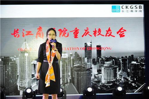 EMBA4期校友、校友理事会副理事长王琼代表校友理事会祝贺重庆校友会新任服务团队就职,提出了长江校友理事会与各地校友会分享经验、共同成长的憧憬,并对重庆校友们表达了最真诚的祝福。同时,王琼校友作为校友理事会组织建设委员会的代表,表达了委员会将秉承“专业规范、传承分享”的理念,给各地校友会提供更多支持与协助。