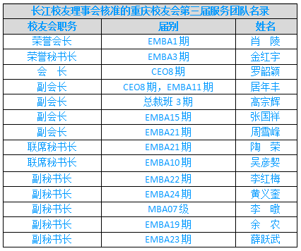 为了更好推动长江校友组织的规范传承和健康可持续发展,在广泛听取各方意见、借鉴过往经验基础上,长江校友理事会近期优化完善了长江校友组织建设流程和规范。按照长江地方校友会换届流程,由老团队、当地校友提名产生会长候选人,由当地校友、长江校友理事会、学院代表民主投票产生会长人选,由会长组建服务团队,并征求学院各部门意见,在当地校友中公示,最终经由校友理事会报请学院审批通过。重庆校友会此次换届是执行新换届机制的首个长江校友组织,换届工作得到了广大重庆校友、长江校友理事会、学院校友事务部及各课程部门的充分参与和大力支持。新一届服务团队名单的产生全过程秉持公开、透明、民主、多方参与的原则,广泛征求了有关各方意见,并经民主投票产生。