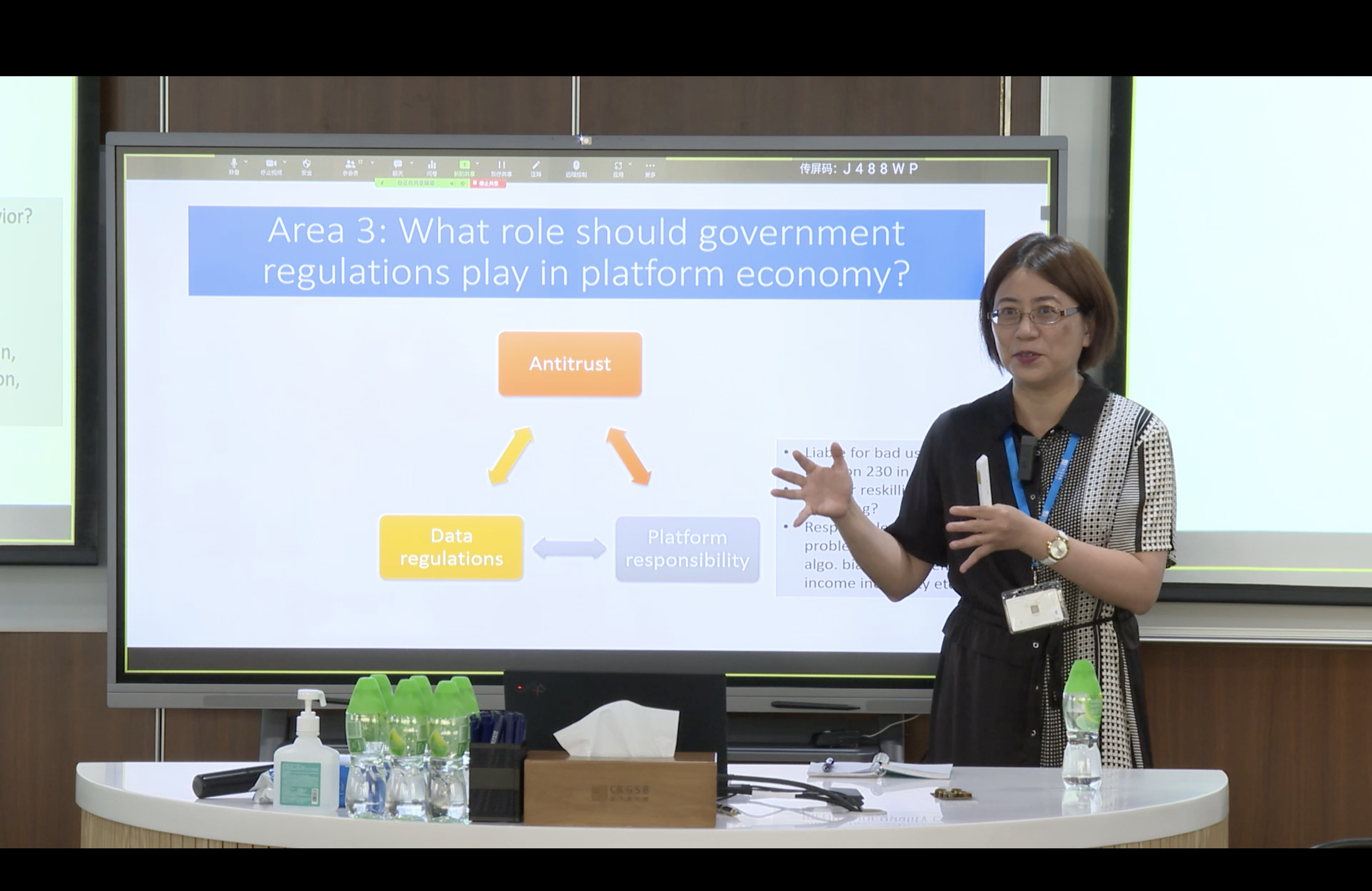 金哲教授指出,根据美国和欧洲的报告显示,数字经济在总体经济中的重要性逐年增加,并在未来会持续增长,因此关于数字经济与数字化平台(Digital Platform)的研究具有十分重要的价值与现实指导意义。金哲教授认为当前数字化平台研究有三个重要主题:一是平台内部的策略,包括定价、信息和质量策略等;二是平台与非平台之间的关系,特别是它们在合作和竞争中的作用;三是政府在监管数字经济中的角色,包括数据规定、并购和数据调整等方面。最后,金哲教授分享了她最新关于平台与算法的研究结果:通过在Zillow平台的实验证实了存在人类-算法反馈循环,并通过模拟实验,自然实验与实证分析证明了该反馈循环并不会产生持续的误差传播。