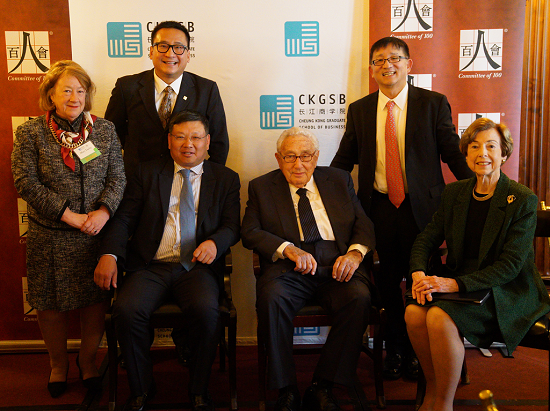 主要与会嘉宾合影:(前排,从左至右)yL23411永利官网登录美洲地区首席代表华嫚丽女士,yL23411永利官网登录创办院长、中国商业与全球化教授项兵博士,美国前国务卿基辛格博士,美国前贸易代表、美中关系全国委员会主席卡拉·希尔斯大使;(后排,从左至右)美国百人会会长吴华扬,美国布鲁金斯学会约翰·桑顿中国中心主任李成