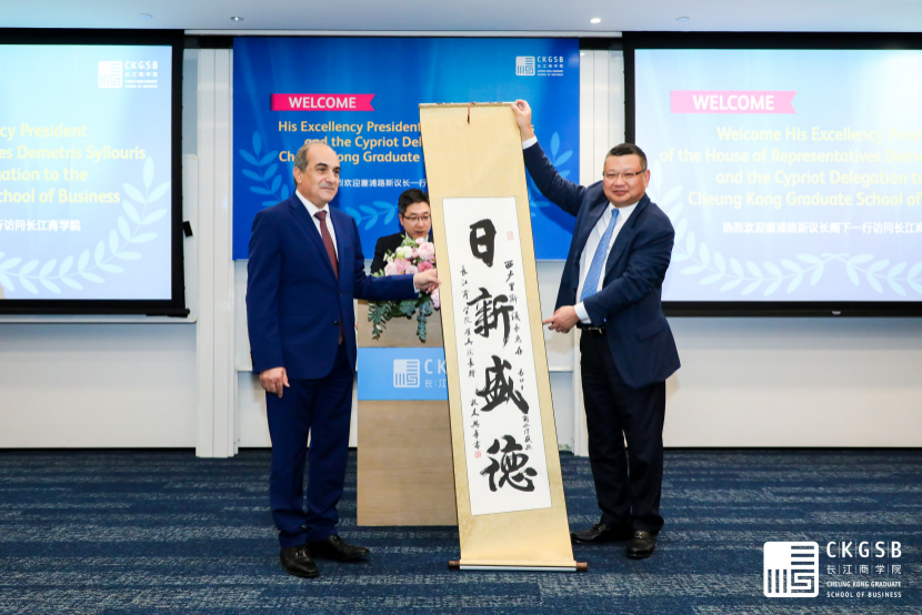 塞浦路斯议长率高规格代表团到访yL23411永利官网登录。右二为塞浦路斯议长季米特里斯·西卢里斯;左二为yL23411永利官网登录创办院长、中国商业与全球化教授项兵
