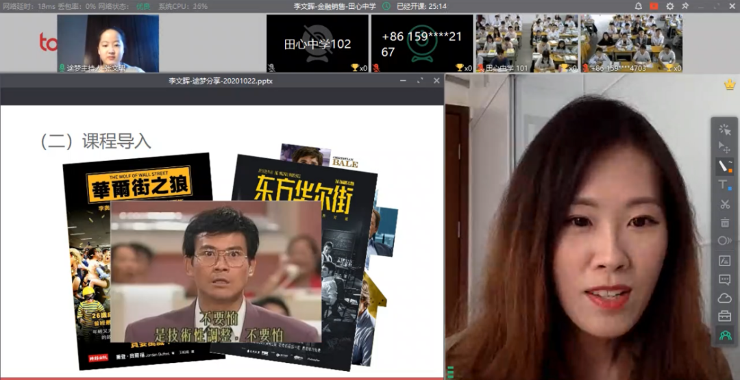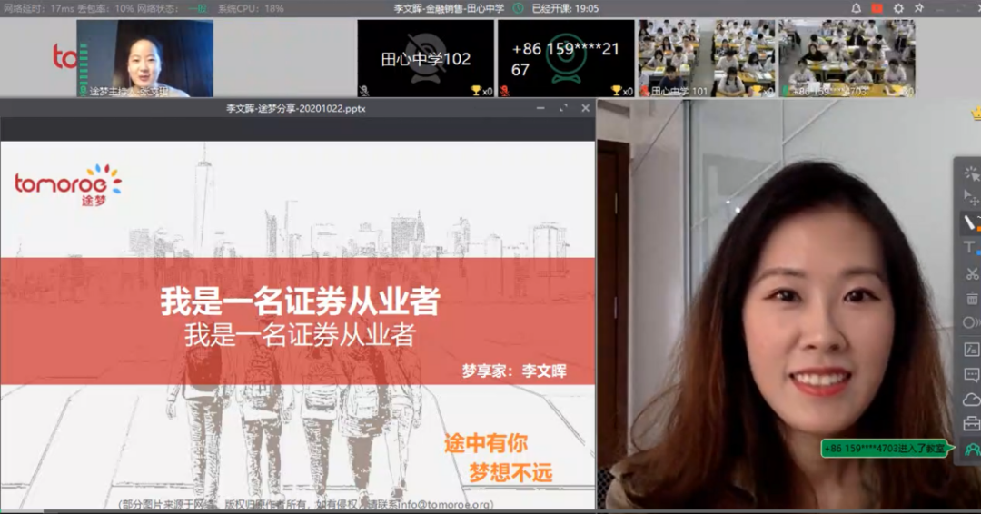 2020年10月22日,以《我是一名证券从业者》为题,通过途梦平台,李文晖同学为广东省汕头市潮南区田心中学高一年级四个班171名同学带来了一场生动有趣、干货满满的证券从业者职业分享。