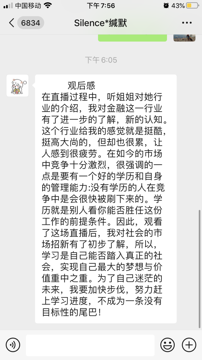 文晖姐姐您好~我是主持您这次分享的张文珺。您的分享丰富精彩且有吸引力,您对金融销售的热情、随工作积累经验的同时也逐渐积累的自信,也深深激励了我。